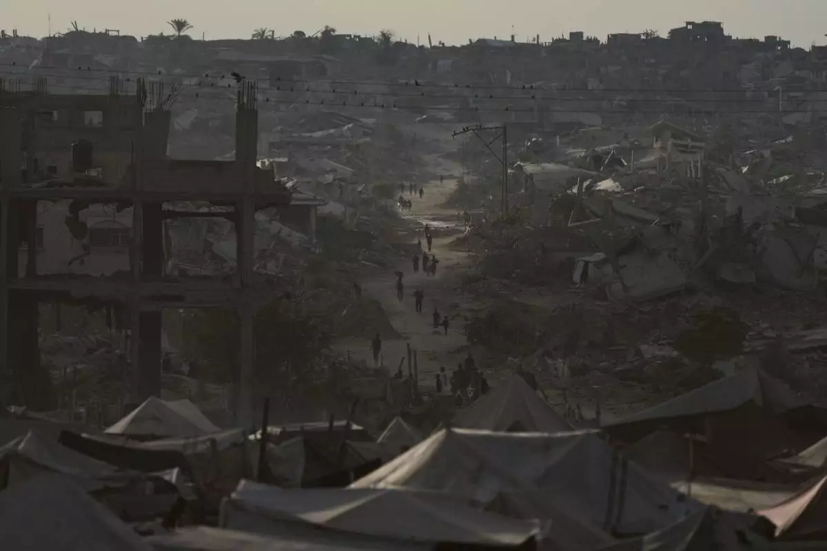Displaced Palestinians walk trough destroyed homes and buildings in Khan Younis, Gaza Strip, Saturday, Oct. 18, 2025. (AP Photo/Jehad Alshrafi)