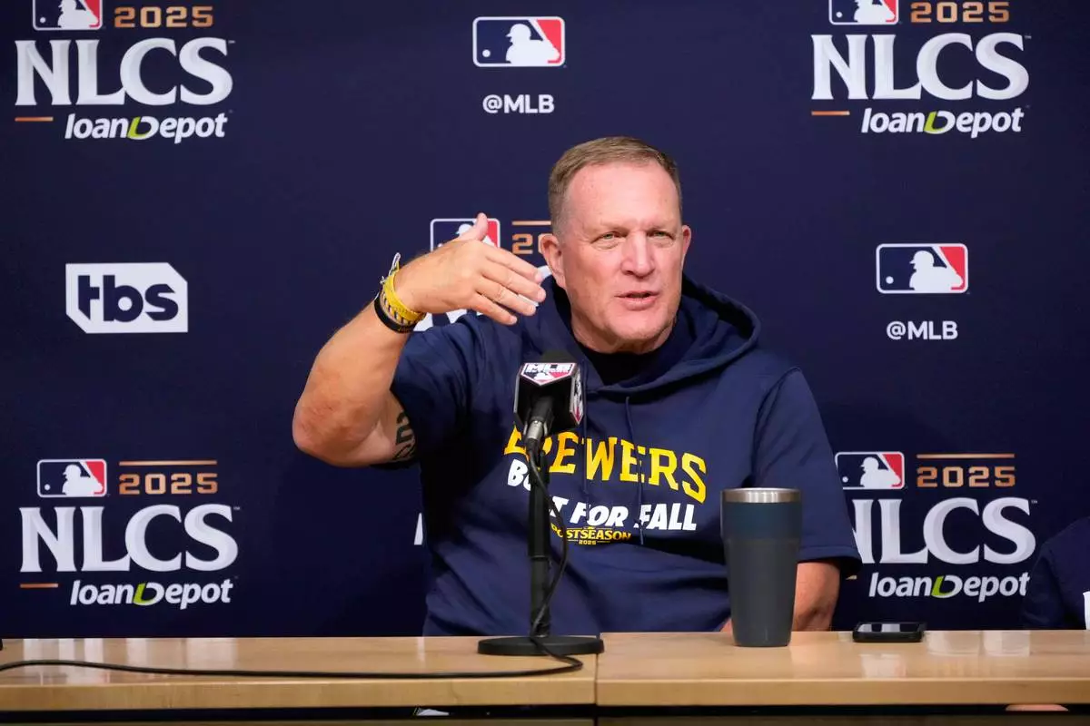 Milwaukee Brewers manager Pat Murphy speaks during a news conference ahead of Game 3 of baseball's National League Championship Series against the Los Angeles Dodgers, Wednesday, Oct. 15, 2025, in Los Angeles. (AP Photo/Mark J. Terrill)