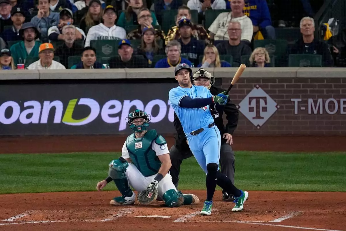 Toronto Blue Jays' George Springer follows through on an RBI double against the Seattle Mariners during the fifth inning in Game 5 of baseball's American League Championship Series, Friday, Oct. 17, 2025, in Seattle. (AP Photo/David J. Phillip)