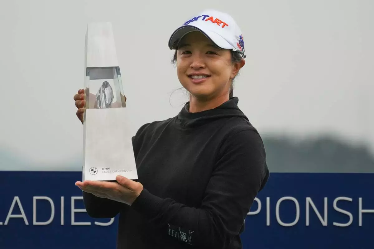 Sei Young Kim of South Korea holds the winning trophy during the awards ceremony after winning the LPGA Ladies Championship golf tournament at the Pine Beach Golf Links, in Haenam, South Korea, Sunday, Oct. 19, 2025. (AP Photo/Lee Jin-man)