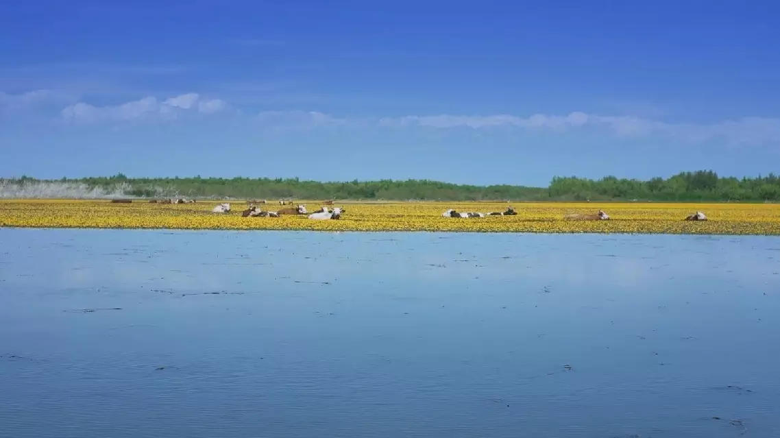 To restore the environment, the primary task was to bring water back. In 2018, the region began an eco-transfer -- water from the Kaidu River was diverted into the lake. In 2022, for the first time ever, the floodgates of the Qingshui River east and west branches hundreds of kilometers away were also opened to feed the lake. Over the past eight years, a total of 15.4 billion cubic meters of water has been sent in, and the water level on the lake has been maintained consistently at around a healthy 1 046.8 meters.