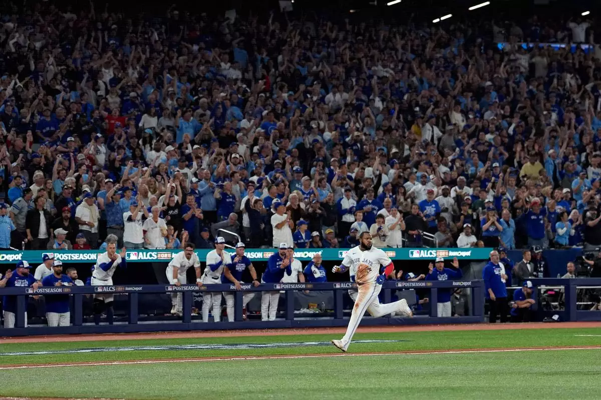 Toronto Blue Jays' Vladimir Guerrero Jr. scores on after throwing error during the seventh inning in Game 6 of baseball's American League Championship Series against the Seattle Mariners, Sunday, Oct. 19, 2025, in Toronto. (AP Photo/David J. Phillip)
