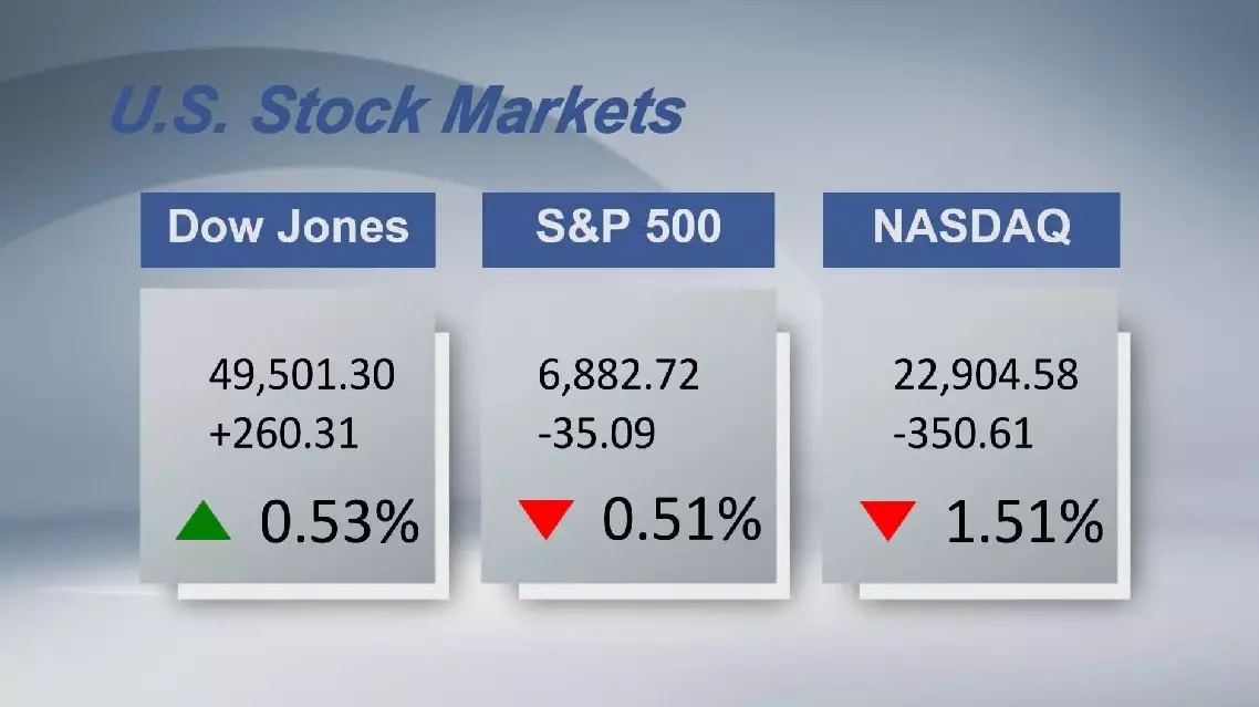 The Dow Jones Industrial Average rose 260.31 points, or 0.53 percent, to 49,501.30. The Standard and Poor's 500 sank 35.09 points, or 0.51 percent, to 6,882.72. The Nasdaq Composite Index decreased by 350.61 points, or 1.51 percent, to 22,904.58.