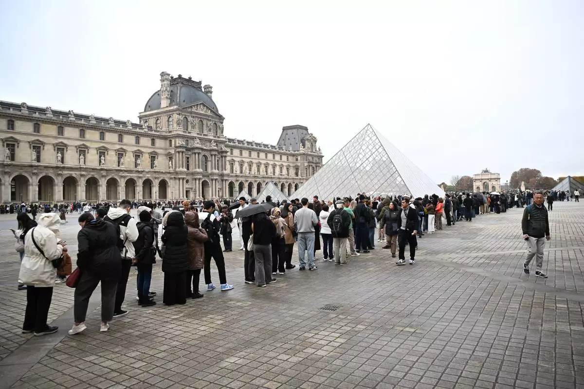 People queue to enter the Louvre museum that will remain closed for the day after Sunday's jewels robbery, Monday, Oct. 20, 2025 in Paris. (AP Photo/Emma Da Silva)