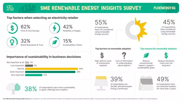 • Cost continues to outweigh climate goals: Nearly two-thirds (62%) of SMEs say price is the most important factor when choosing an electricity retailer, compared to just 15% who cite sustainability. This cost-first mindset highlights a key challenge in Singapore's green transition.