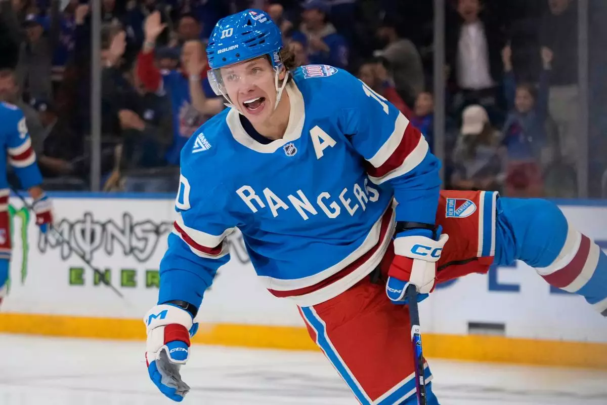 New York Rangers' Artemi Panarin (10) celebrates after scoring a goal during the first period of an NHL hockey game against the Minnesota Wild Monday, Oct. 20, 2025, at Madison Square Garden in New York. (AP Photo/Frank Franklin II)