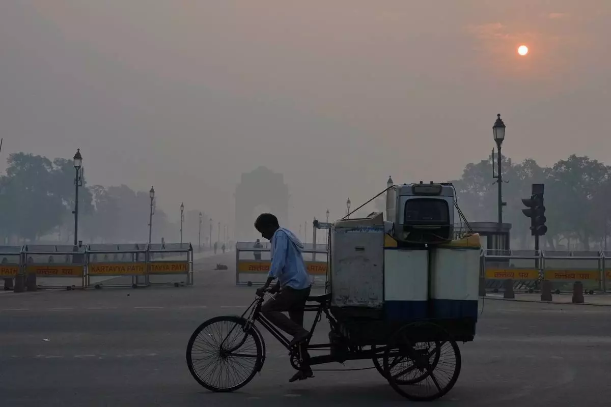 A cyclist pedals through morning smog near the India Gate monument as he transports used home appliances a day after Diwali festival in New Delhi, India, Tuesday, Oct. 21, 2025. (AP Photo/Manish Swarup)