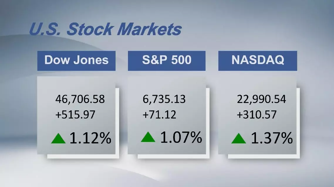 The Dow Jones Industrial Average rose 515.97 points, or 1.12 percent, to 46,706.58. The S&P 500 gained 71.12 points, or 1.07 percent, to 6,735.13. The Nasdaq Composite advanced 310.57 points, or 1.37 percent, to 22,990.54.