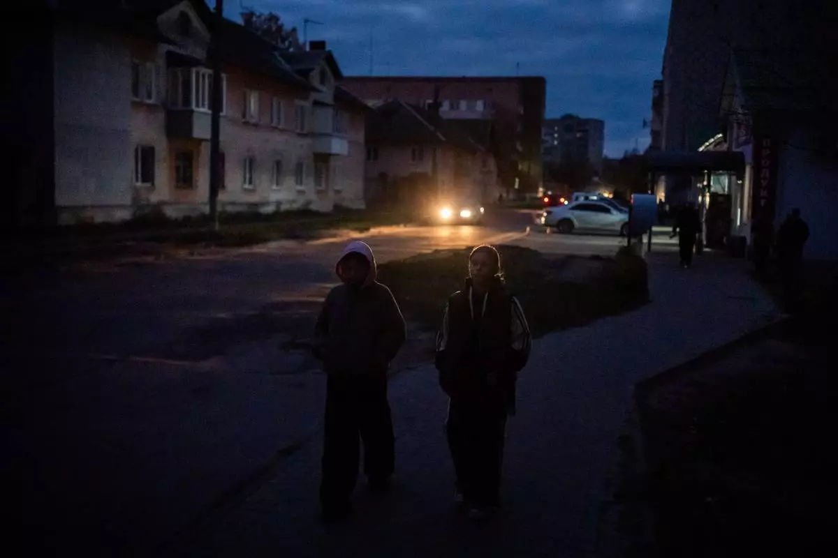 Kids walk along a dark residential street during a rolling blackout, Thursday, Oct. 16, 2025, in Shostka, Ukraine. (AP Photo/Julia Demaree Nikhinson)