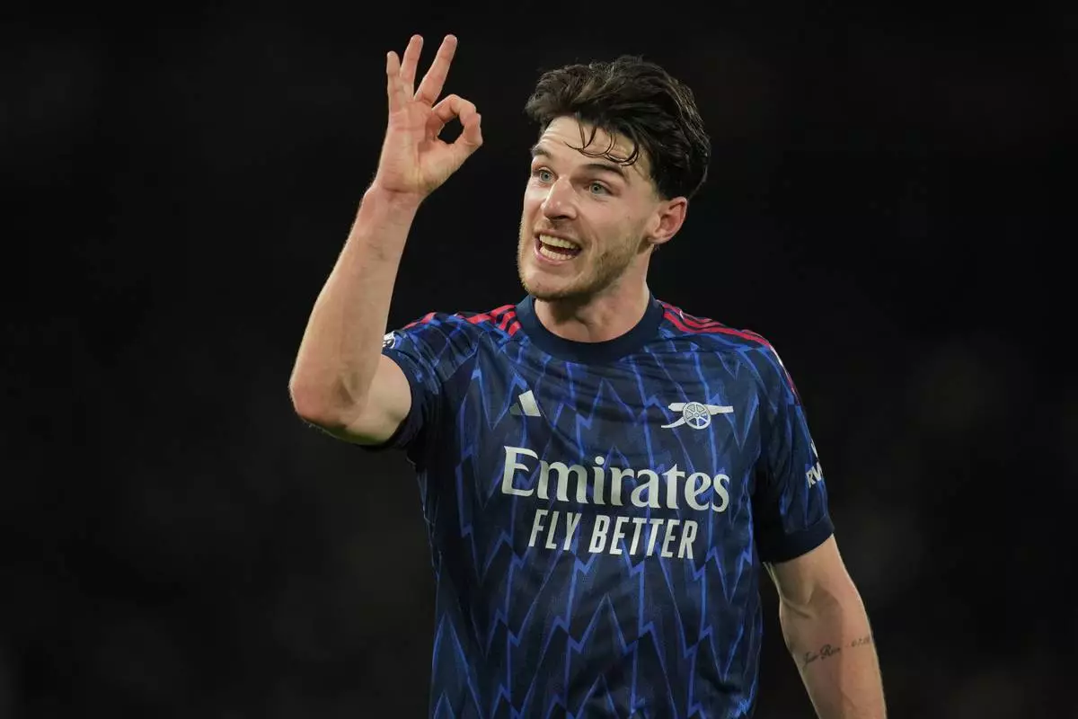 Arsenal's Declan Rice reacts during the Premier League soccer match between Arsenal and Fulham in London, Saturday, Oct. 18, 2025. (AP Photo/Kin Cheung)