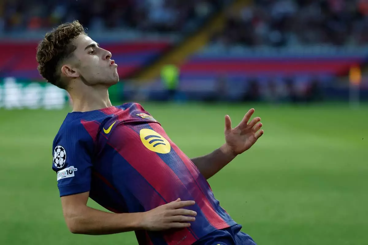 Barcelona's Fermin Lopez celebrates after scoring the opening goal of his team during the Champions League opening phase soccer match between Barcelona and Olympiacos in Barcelona, Spain, Tuesday, Oct. 21, 2025. (AP Photo/Joan Monfort)