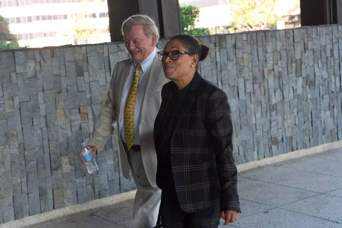 Shawn Holley, right, and Rusty Hardin, attorneys for the family of former baseball pitcher Tyler Skaggs, arrive during the trial for the wrongful death lawsuit accusing the Los Angeles Angels baseball team of being responsible for the 2019 drug overdose death of Skaggs Tuesday, Oct. 21, 2025, in Santa Ana, Calif. (AP Photo/Gregory Bull)
