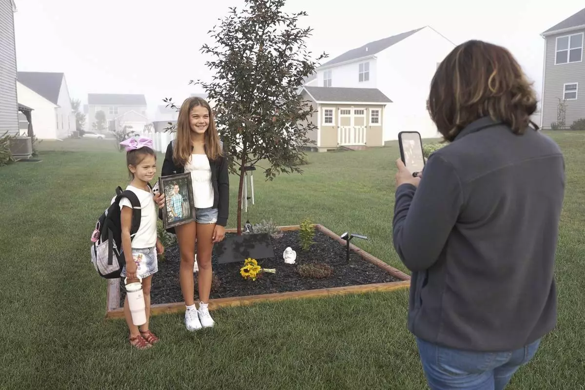 Ashlee Dahlberg takes photos of her daughters Ava, left, and Khloe, on the first day of school in front a memorial for their brother, Liam, in their yard in Lowell, Ind., on Wednesday, Aug. 13, 2025. (AP Photo/Laura Bargfeld)