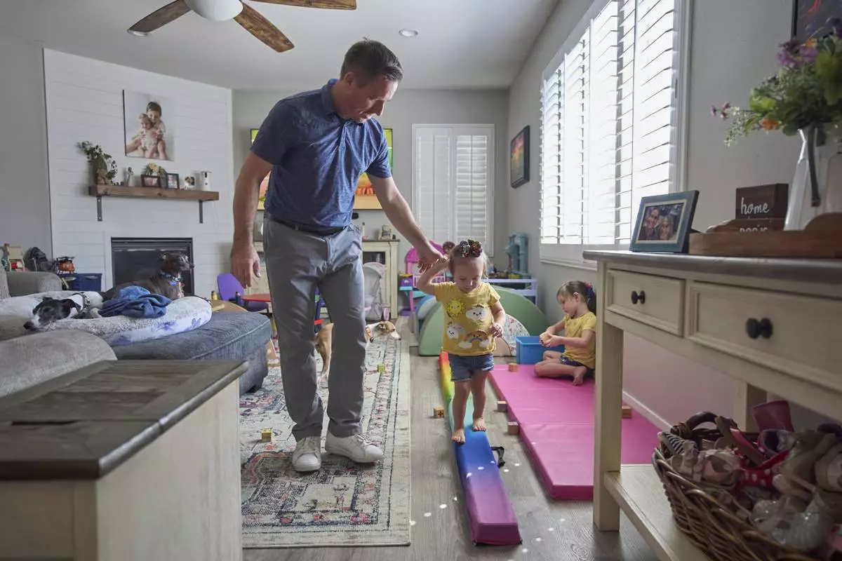 Josh Marris holds the hand of his daughter, Brooklyn Marris, as she walks on a balance board as her sister, Alana, right, plays at their home in Winchester, Calif., on Thursday, Sept. 18, 2025. (AP Photo/Gregory Bull)