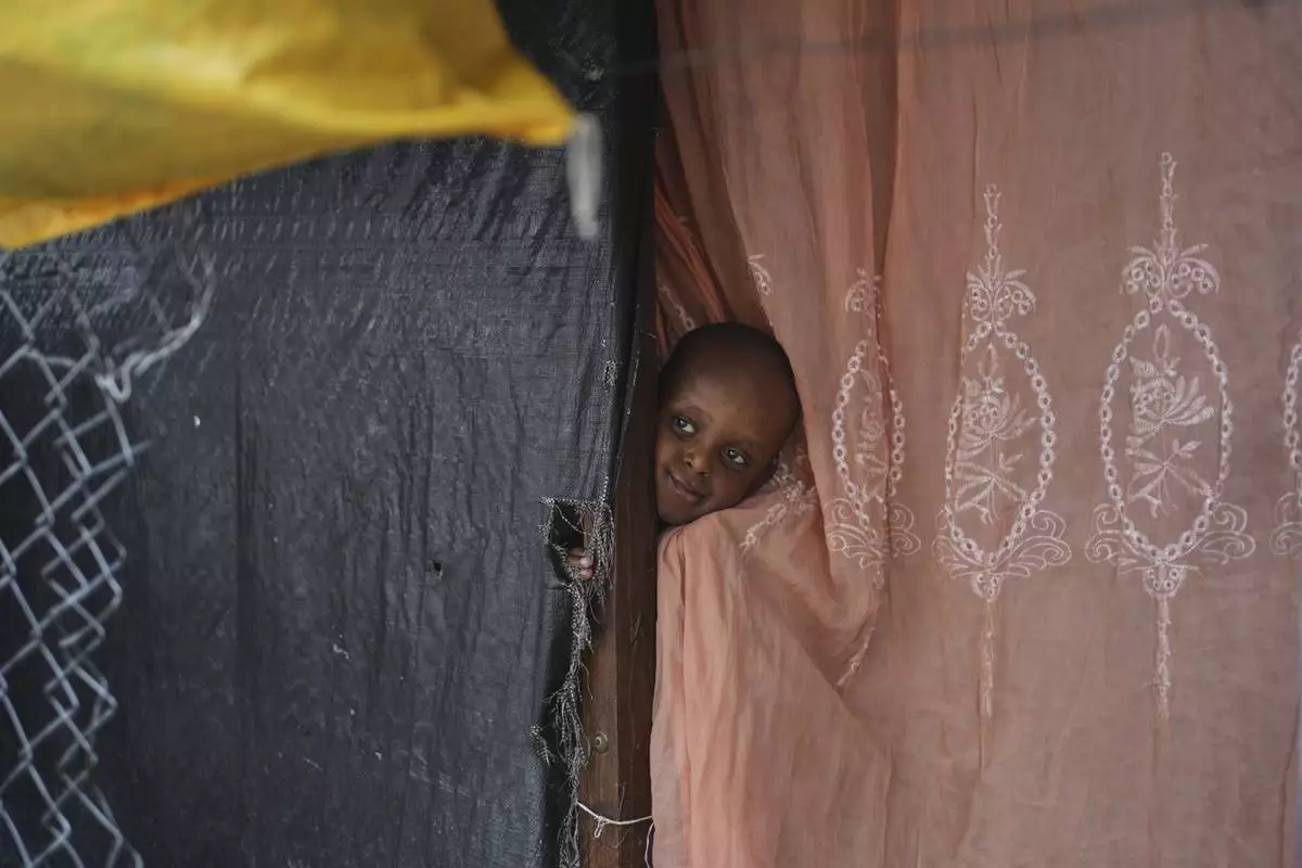 A child pokes his head out from behind a curtain at a shelter for families displaced by gang violence in Port-au-Prince, Haiti, Tuesday, Oct. 21, 2025. (AP Photo/Odelyn Joseph)