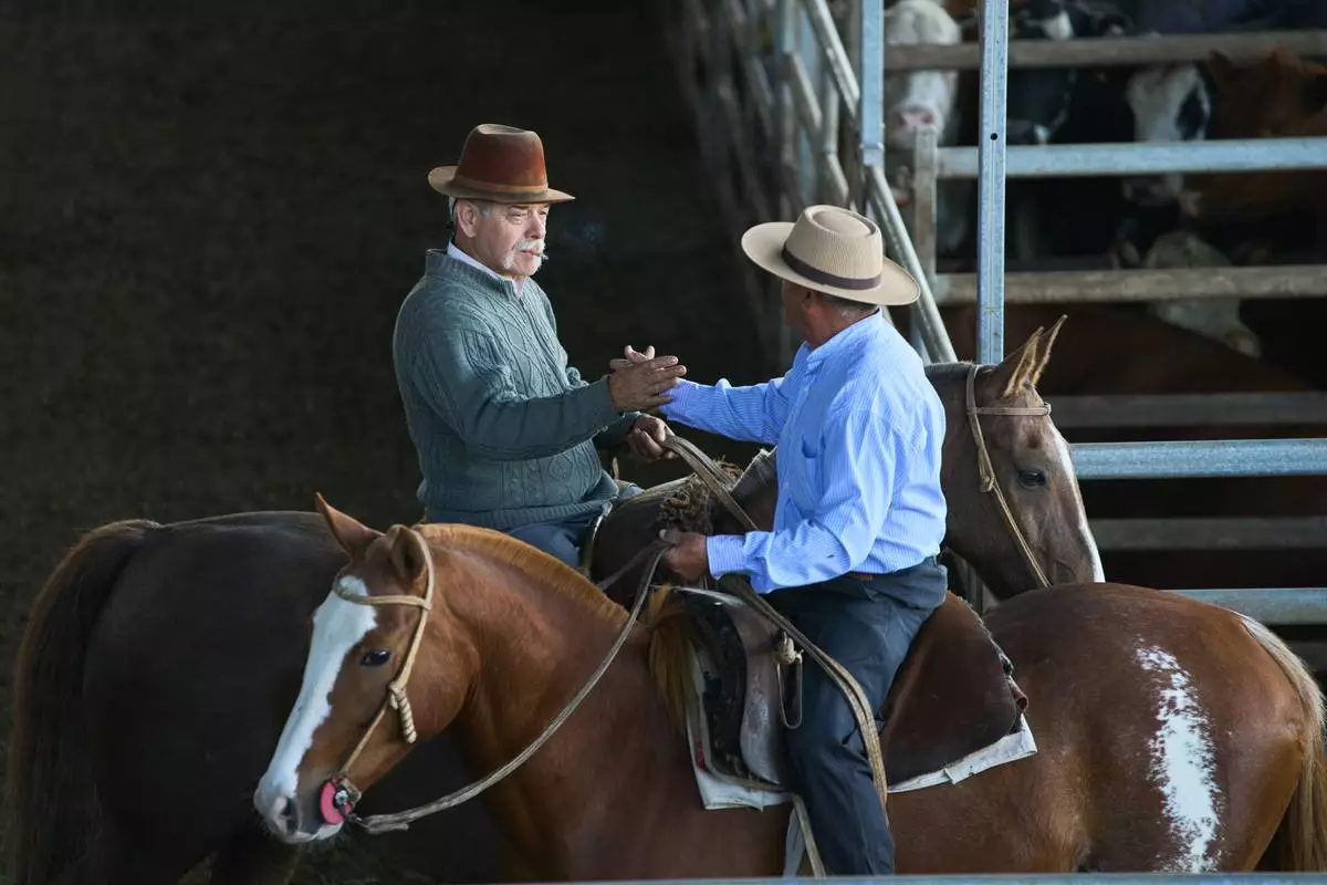 Handlers shake hands at the livestock market in Canuelas, Argentina's main cattle trading hub, Tuesday, Oct. 21, 2025. (AP Photo/Rodrigo Abd)