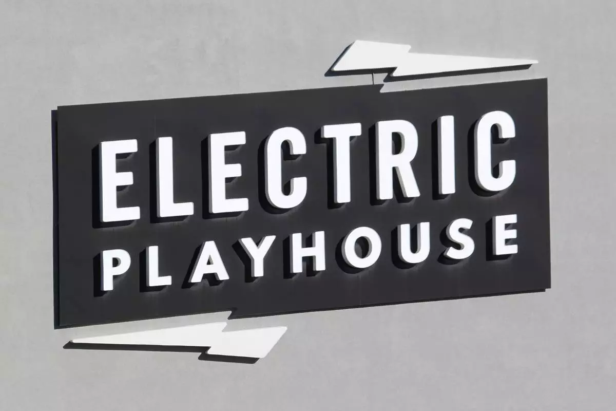 A large sign greets visitors at the first location of the Electric Playhouse in Albuquerque, N.M., Tuesday, Oct. 21, 2025. (AP Photo/Susan Montoya Bryan)