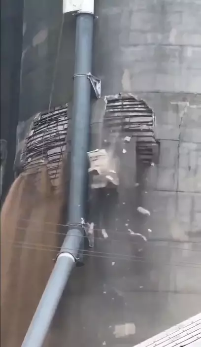 Soybean granary collapses, beans flooding out. Screenshot from X Video.