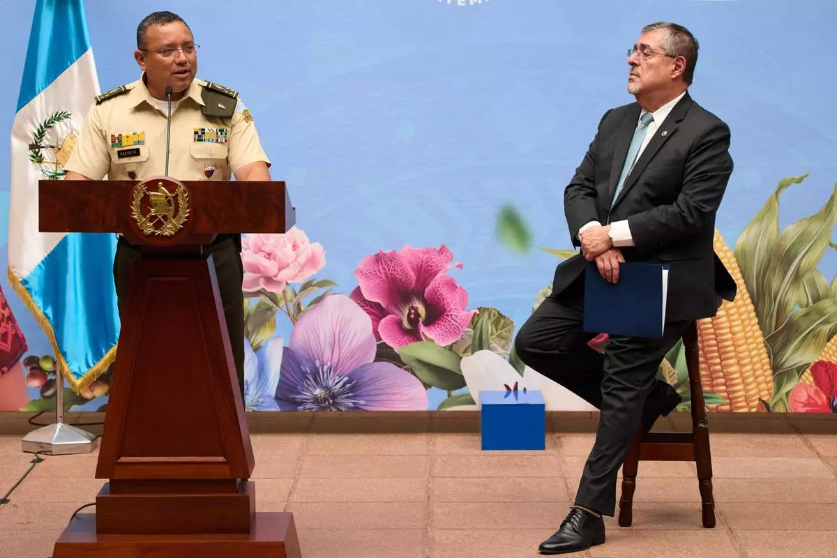 Guatemalan President Bernardo Arévalo, right, and Defense Minister Gen. Henry Saenz give a press conference about Barrio 18 gang members who escaped a maximum-security prison a week prior, in Guatemala City, Tuesday, Oct. 21, 2025. (AP Photo/Moises Castillo)