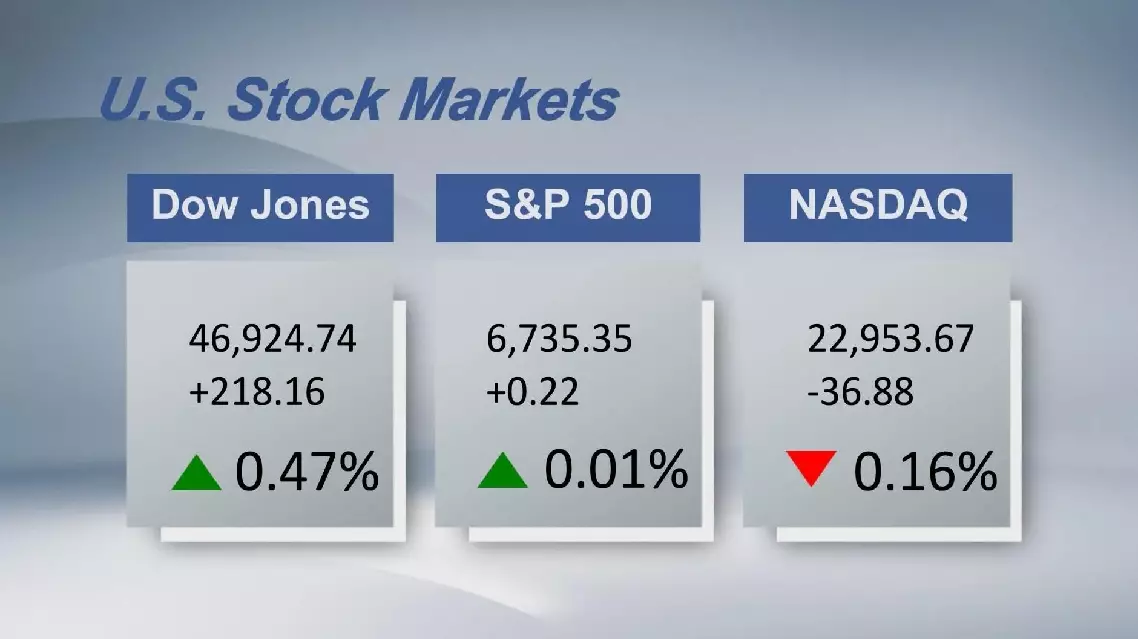 The Dow Jones Industrial Average rose 218.16 points, or 0.47 percent, to a record 46,924.74. The S&P 500 inched up 0.22 points, or less than 0.01 percent, to 6,735.35. The Nasdaq Composite slipped 36.88 points, or 0.16 percent, to 22,953.67.