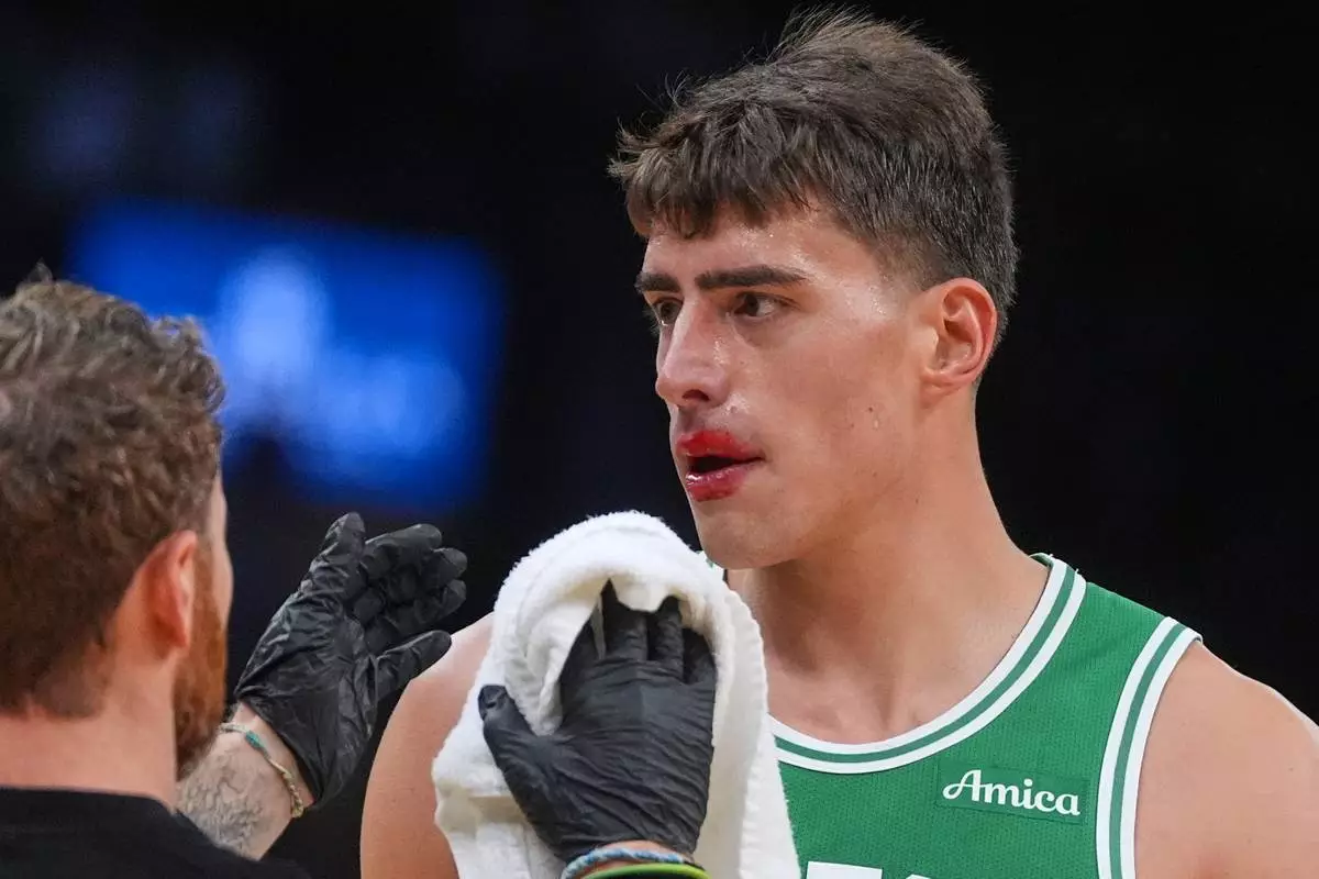 Boston Celtics center Luka Garza has his bloodied face examined during the second half of an NBA basketball game against the Philadelphia 76ers, Wednesday, Oct. 22, 2025, in Boston. (AP Photo/Charles Krupa)