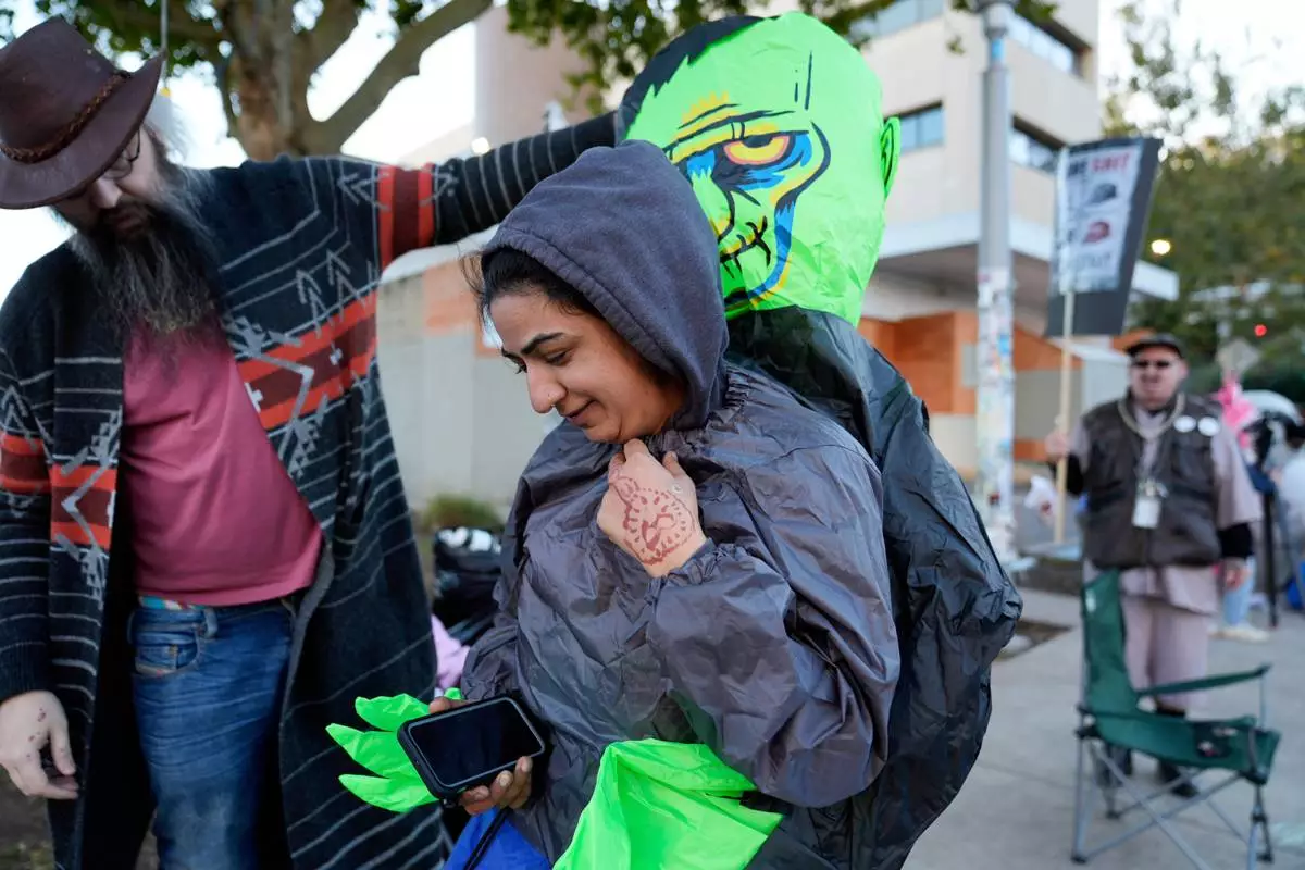 Some groups have started giving out the costumes to encourage more demonstrators to wear them. In Austin, Texas, college student Natalie McCabe got a free inflatable bald eagle costume. At the recent No Kings rally, she hung out with a unicorn and a frog.
