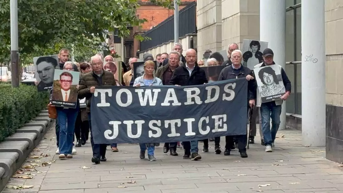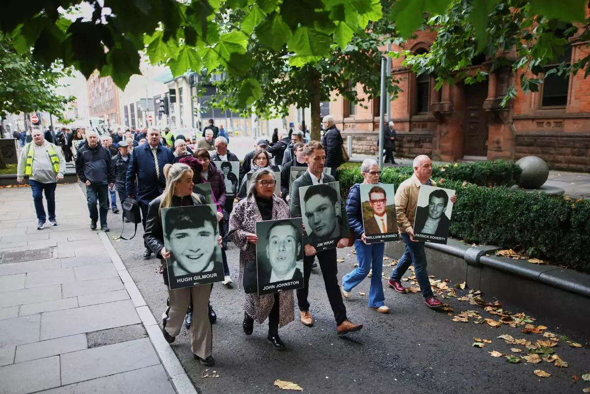 Relatives and supporters of the victims of the 1972 Bloody Sunday massacre march to Belfast Crown Court ahead of the verdict on the trial of a British soldier identified only as Soldier F, Belfast, in Northern Ireland, Thursday, Oct. 23, 2025. (AP Photo/Peter Morrison)
