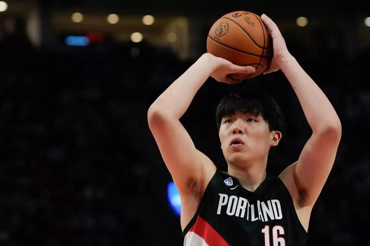 Portland Trail Blazers center Yang Hansen shoots during the first half of NBA basketball game against the Minnesota Timberwolves on Wednesday, Oct. 22, 2025, in Portland, Ore. It was his first point scored during a regular season NBA basketball game. (AP Photo/Jenny Kane)
