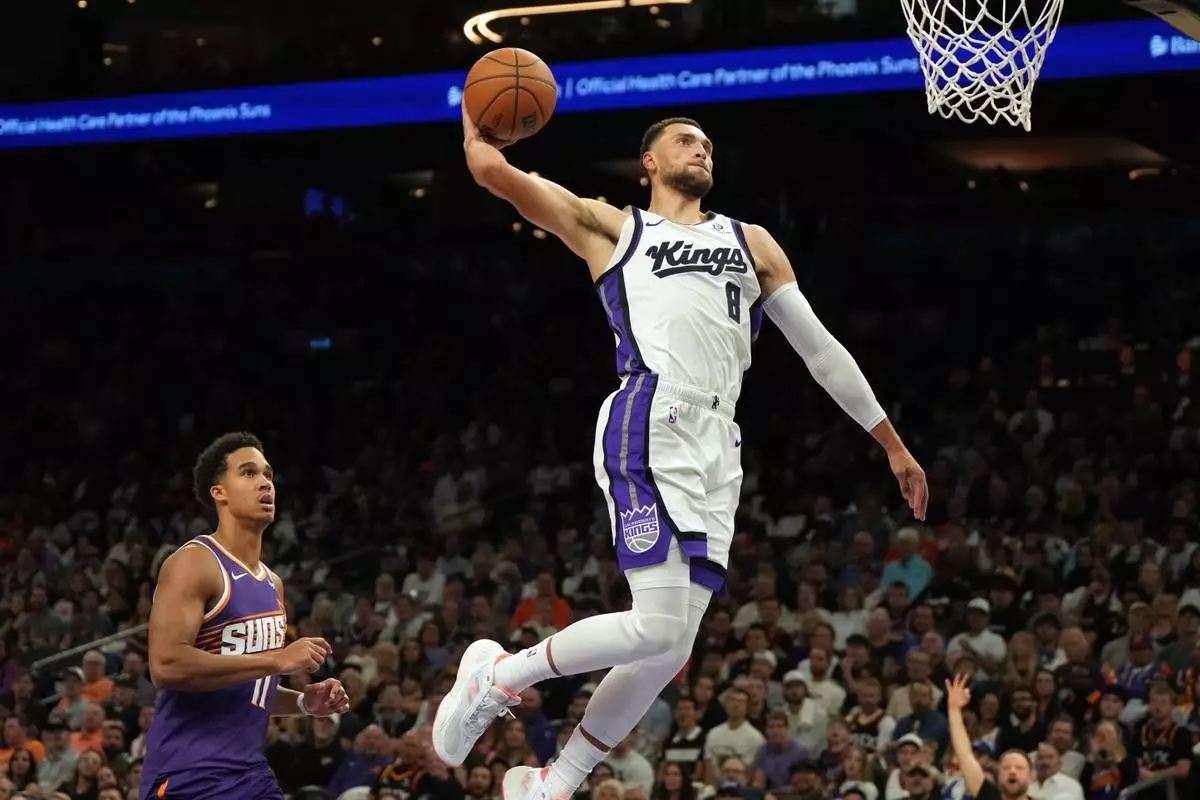 Sacramento Kings guard Zach LaVine (8) dunks over Phoenix Suns forward Oso Ighodaro during the first half of an NBA basketball game, Wednesday, Oct. 22, 2025, in Phoenix. (AP Photo/Rick Scuteri)