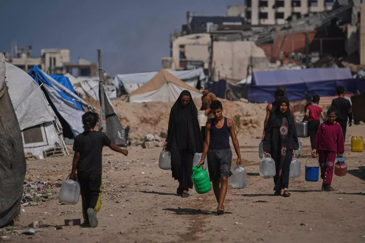 Palestinians carry jerrycans and plastic bottles with water after collecting it at a camp for displaced people in Gaza City, Thursday Oct. 23, 2025. (AP Photo/Abdel Kareem Hana)