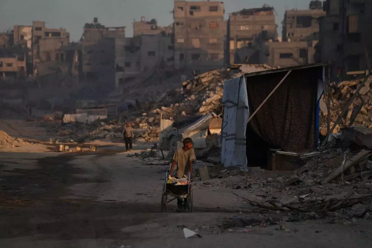 Palestinians walk trough the destruction caused by the Israeli air and ground offensive in Sheikh Radwan neighborhood in Gaza City, Wednesday, Oct. 22, 2025. (AP Photo/Abdel Kareem Hana)