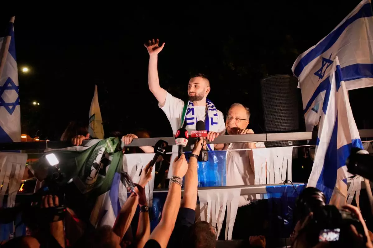 Freed Israeli hostage Matan Angrest, center, who was recently released from Hamas captivity in Gaza, greets supporters upon returning home to Kiryat Bialik, Israel, from the hospital, Thursday, Oct. 23, 2025. (AP Photo/Ohad Zwigenberg)