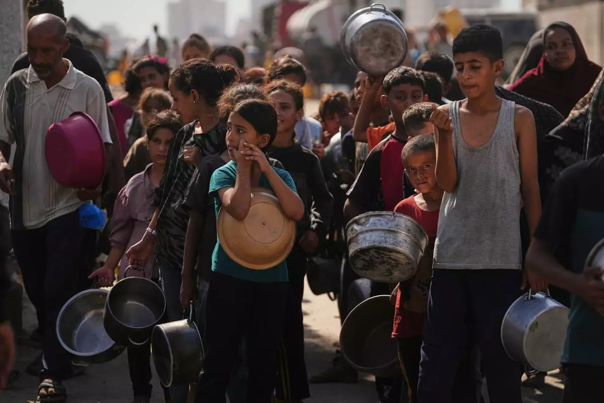 Palestinians wait to receive donated food at a community kitchen in Gaza City, Thursday, Oct. 23, 2025. (AP Photo/Abdel Kareem Hana)