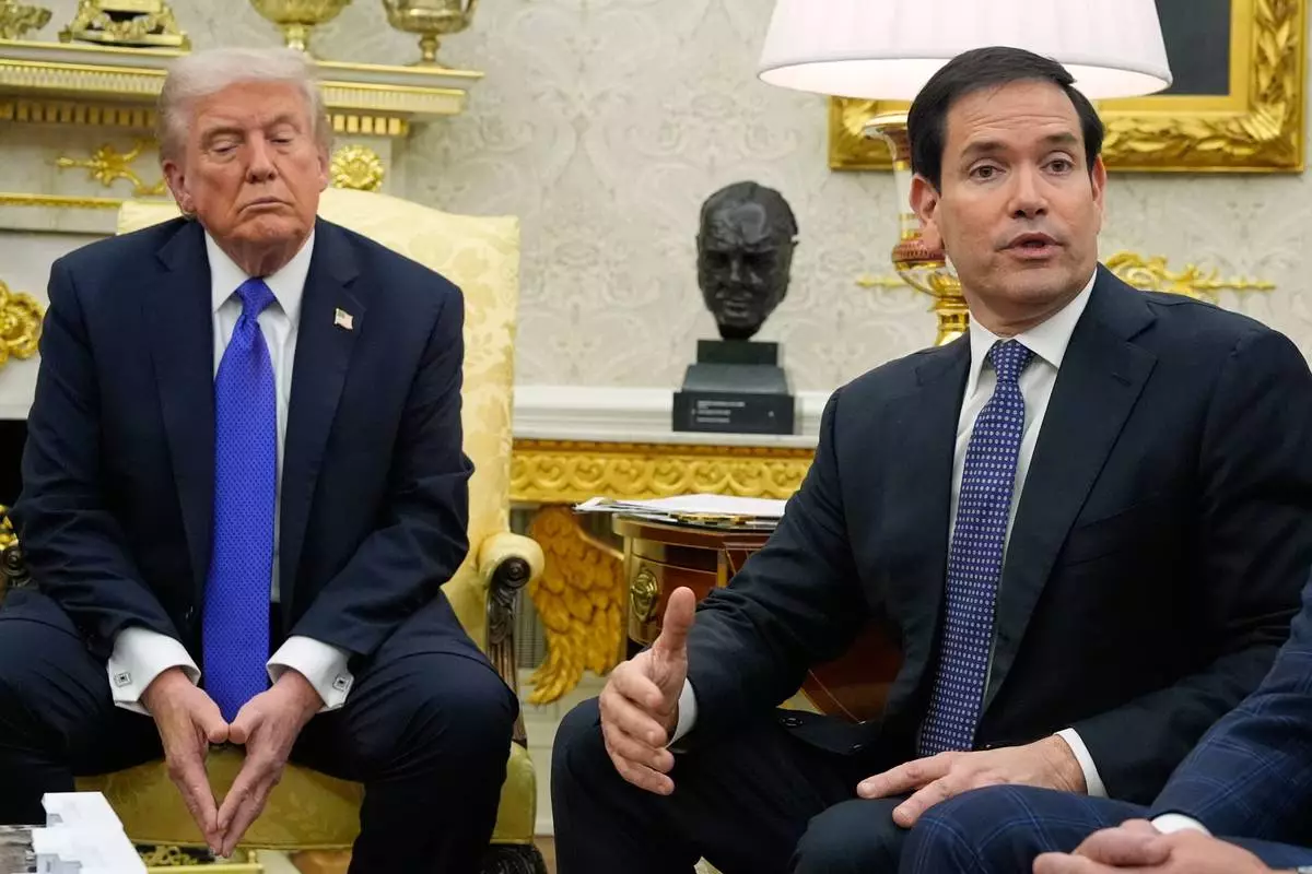 President Donald Trump listens as Secretary of State Marco Rubio speaks during a meeting with NATO Secretary General Mark Rutte in the Oval Office of the White House, Wednesday, Oct. 22, 2025, in Washington. (AP Photo/Alex Brandon)