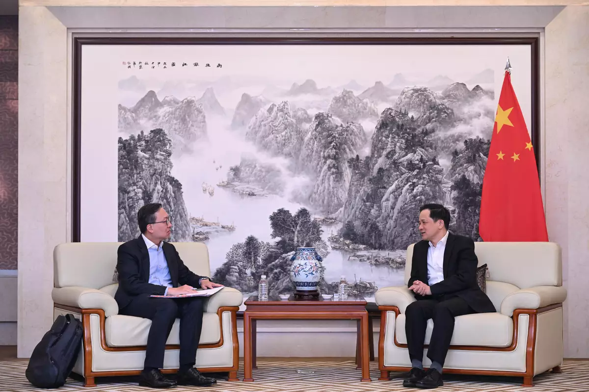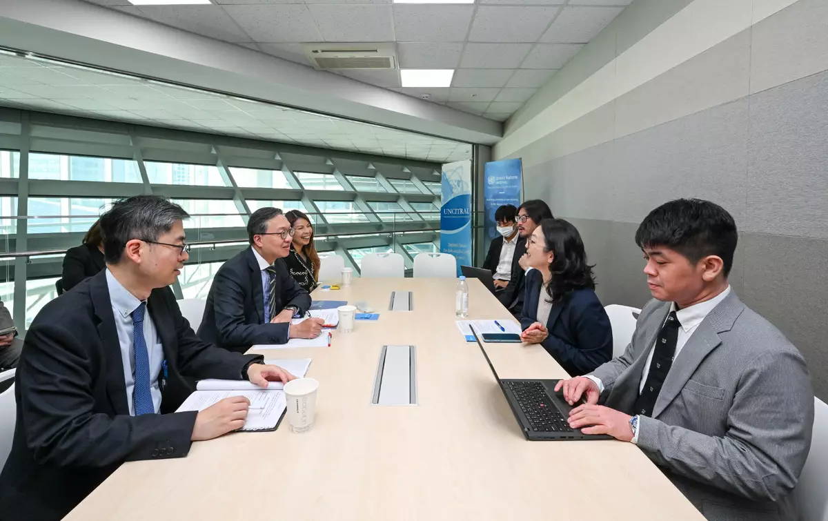 Mr Lam visited the United Nations Commission on International Trade Law (UNCITRAL) Regional Centre for Asia and the Pacific in the afternoon and met with the Head of the Centre, Ms Athita Komindr. He thanked the Commission for its support to the Department of Justice (DoJ), emphasising the close and fruitful collaboration between the two sides over the years. The 6th UNCITRAL Asia Pacific Judicial Summit, a biennial flagship event jointly organised by UNCITRAL and the DoJ, will be held in Hong Kong during the Hong Kong Legal Week this December. To align with the theme "Linking Laws, Bridging Worlds" of the Legal Week this year, the summit will explore topics related to the application of digital economy, virtual assets, artificial intelligence, and other relevant subjects in the judicial field. Legal and dispute resolution professionals and academics from around the world will attend the summit.