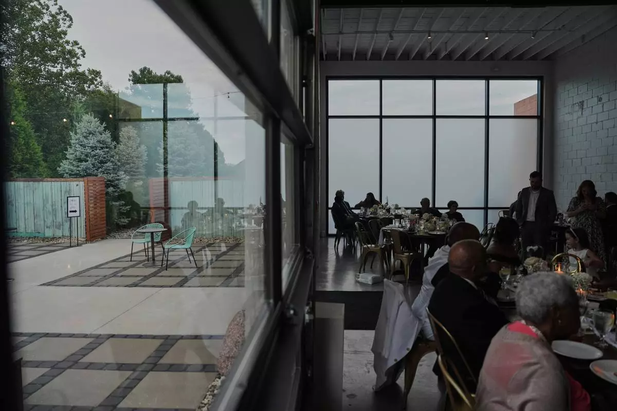 FILE - Guests sit inside during cocktail hour as empty chairs sit outside during a wedding Saturday, Aug. 23, 2025, in Newtown, Ohio. (AP Photo/Joshua A. Bickel, File)