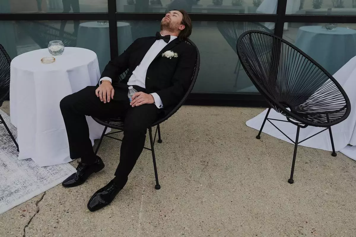 FILE - A Groomsman takes a break after finishing bridal party photos at a wedding on Saturday, Aug. 23, 2025, in Newtown, Ohio. (AP Photo/Joshua A. Bickel, File)