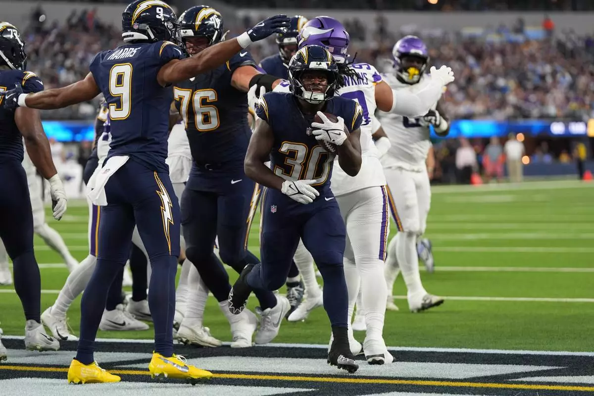 Los Angeles Chargers running back Kimani Vidal (30) scores a touchdown during the first half of an NFL football game against the Minnesota Vikings Thursday, Oct. 23, 2025, in Inglewood, Calif. (AP Photo/Gregory Bull)