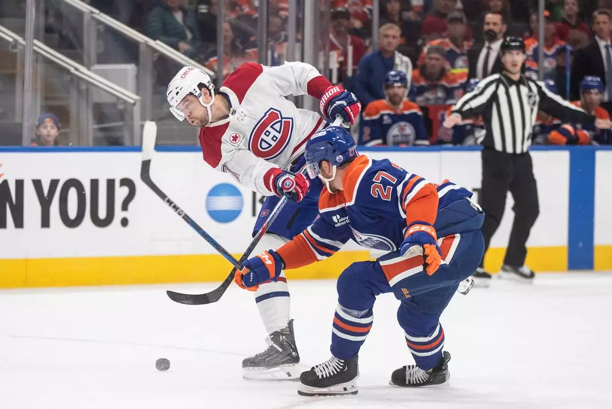 Montreal Canadiens' Josh Anderson (17) and Edmonton Oilers' Brett Kulak (27) battle for the puck during first period NHL action, in Edmonton on Thursday, Oct. 23, 2025. (Jason Franson/The Canadian Press via AP)