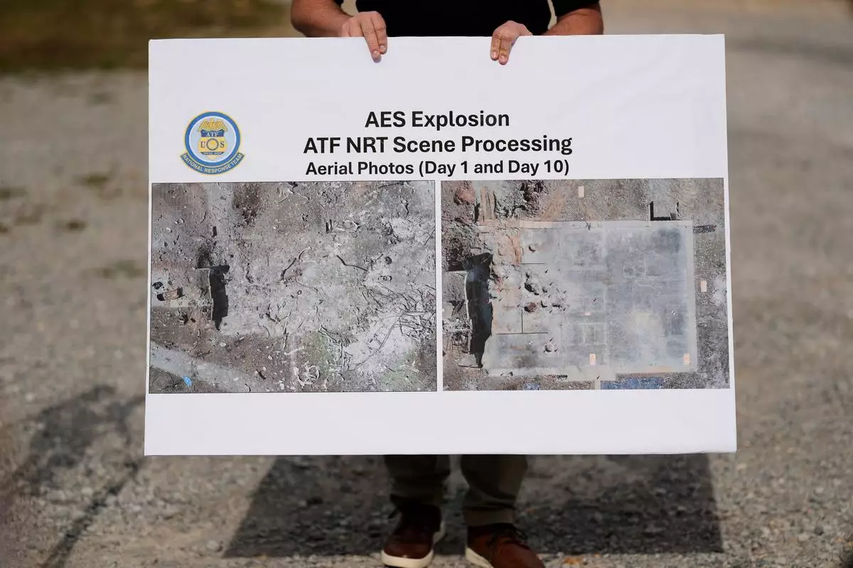 ATF agent Brice McCracken holds a photo of the blast site at Accurate Energetic Systems during a news conference Friday, Oct. 24, 2025, in McEwen, Tenn. (AP Photo/George Walker IV)