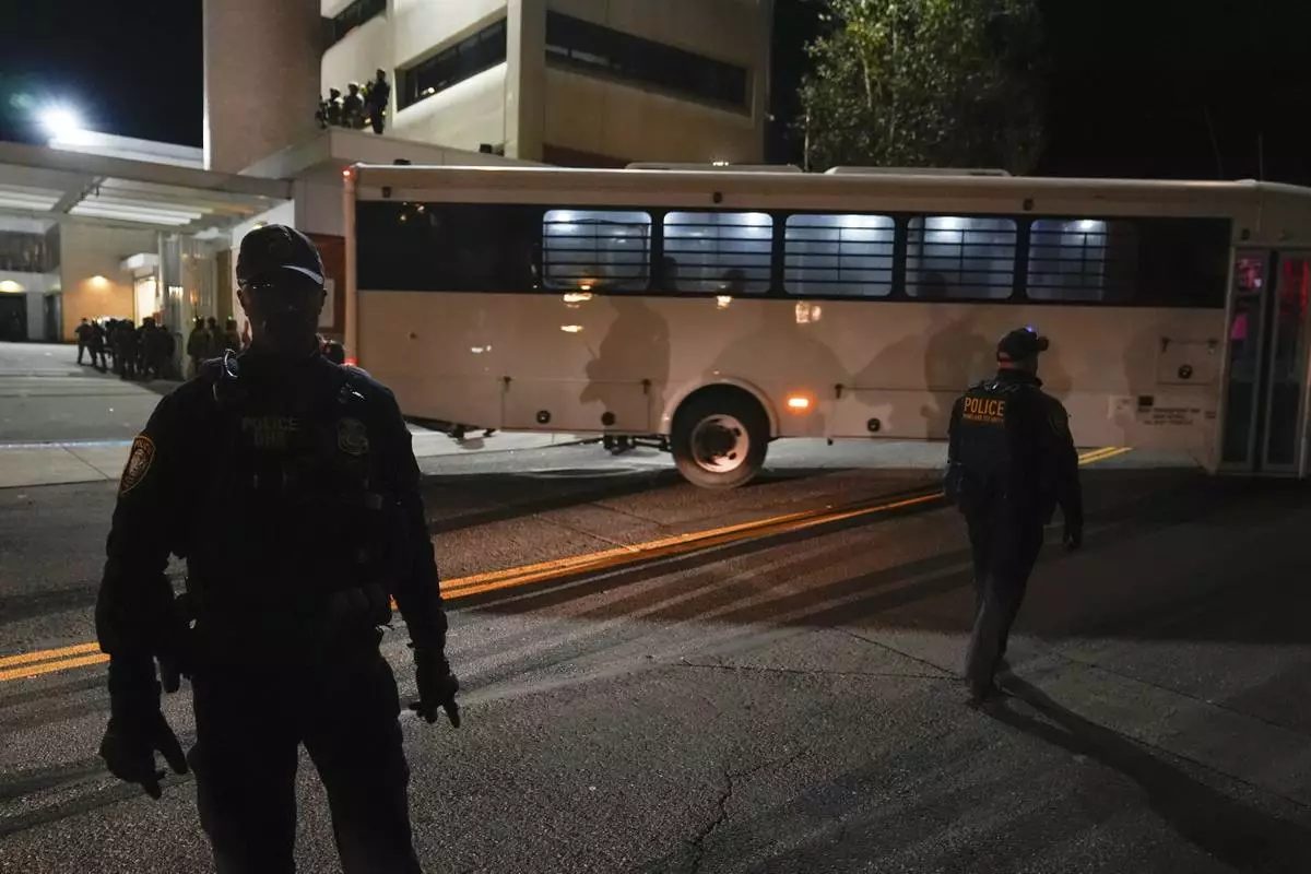 Law enforcement officers line the road outside a United States Immigration and Customs Enforcement (ICE) facility as a bus leaves with passengers on Tuesday, Oct. 21, 2025, in Portland, Ore. (AP Photo/Jenny Kane)