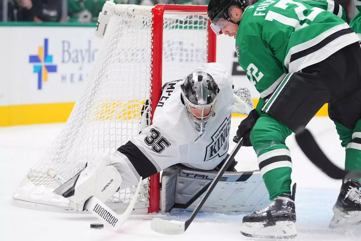 Los Angeles Kings goaltender Darcy Kuemper (35) defends the goal against Dallas Stars center Radek Faksa (12) during the first period of an NHL hockey game Thursday, Oct. 23, 2025, in Dallas. (AP Photo/LM Otero)