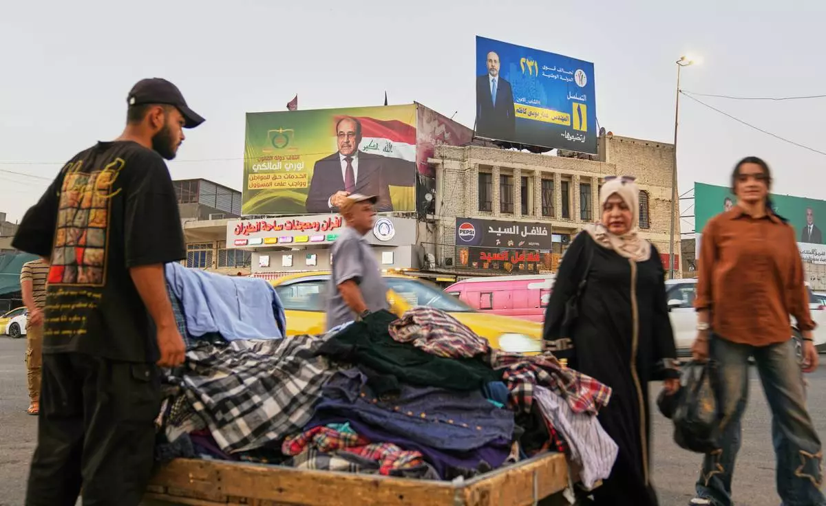 A vendor selling clothes in front of an Iraqi parliamentary elections banner in Baghdad, Iraq, Oct. 16, 2025. (AP Photo/Hadi Mizban)