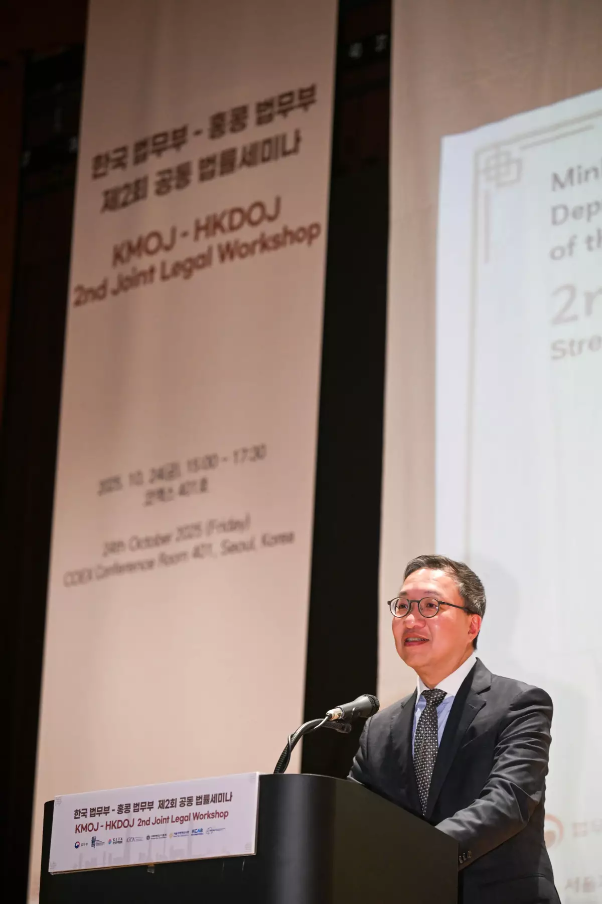 Good afternoon. It is my great honour and pleasure to welcome you all to the 2nd Joint Legal Workshop organised by the Ministry of Justice of the Republic of Korea, the Department of Justice of the Government of the Hong Kong Special Administrative Region of the People's Republic of China, the Korea International Trade Association and the Korea In-House Counsel Association. Our theme today is "Strengthening Business and Legal Cooperation: Korea and Hong Kong". Building on the success of our first legal workshop held in Hong Kong in July last year, this event marks a significant step forward in our ongoing partnership.