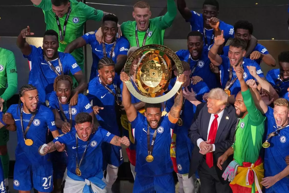 FILE - Chelsea pleayers celebrate with the championship trophy after the Club World Cup final soccer match between Chelsea and PSG in East Rutherford, N.J., Sunday, July 13, 2025. (AP Photo/Matt Slocum, File)