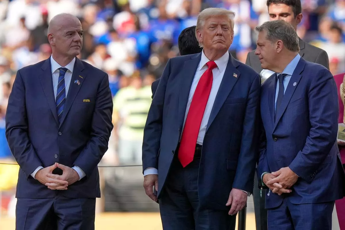 FILE - President Donald Trump, center, talks with Chelsea football club owner Todd Boehly, right, as FIFA president Gianni Infantino, left, looks on before the trophy ceremony of the Club World Cup final soccer match in East Rutherford, N.J., Sunday, July 13, 2025. (AP Photo/Frank Franklin II, File)