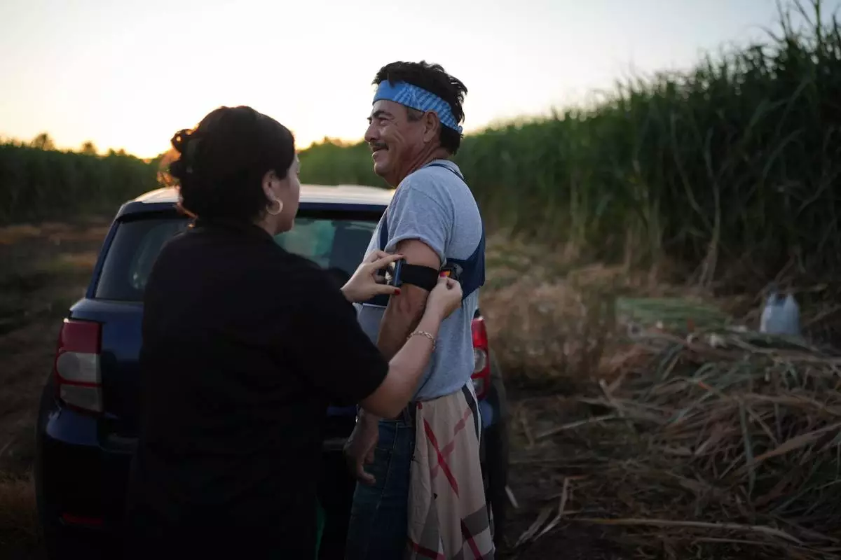 Research assistant Briana Toji straps a wearable heat-stress monitor on farmworker Hipolito Hernandez in a sugarcane field in Niland, Calif., Thursday, Sept. 11, 2025. (AP Photo/Jae C. Hong)