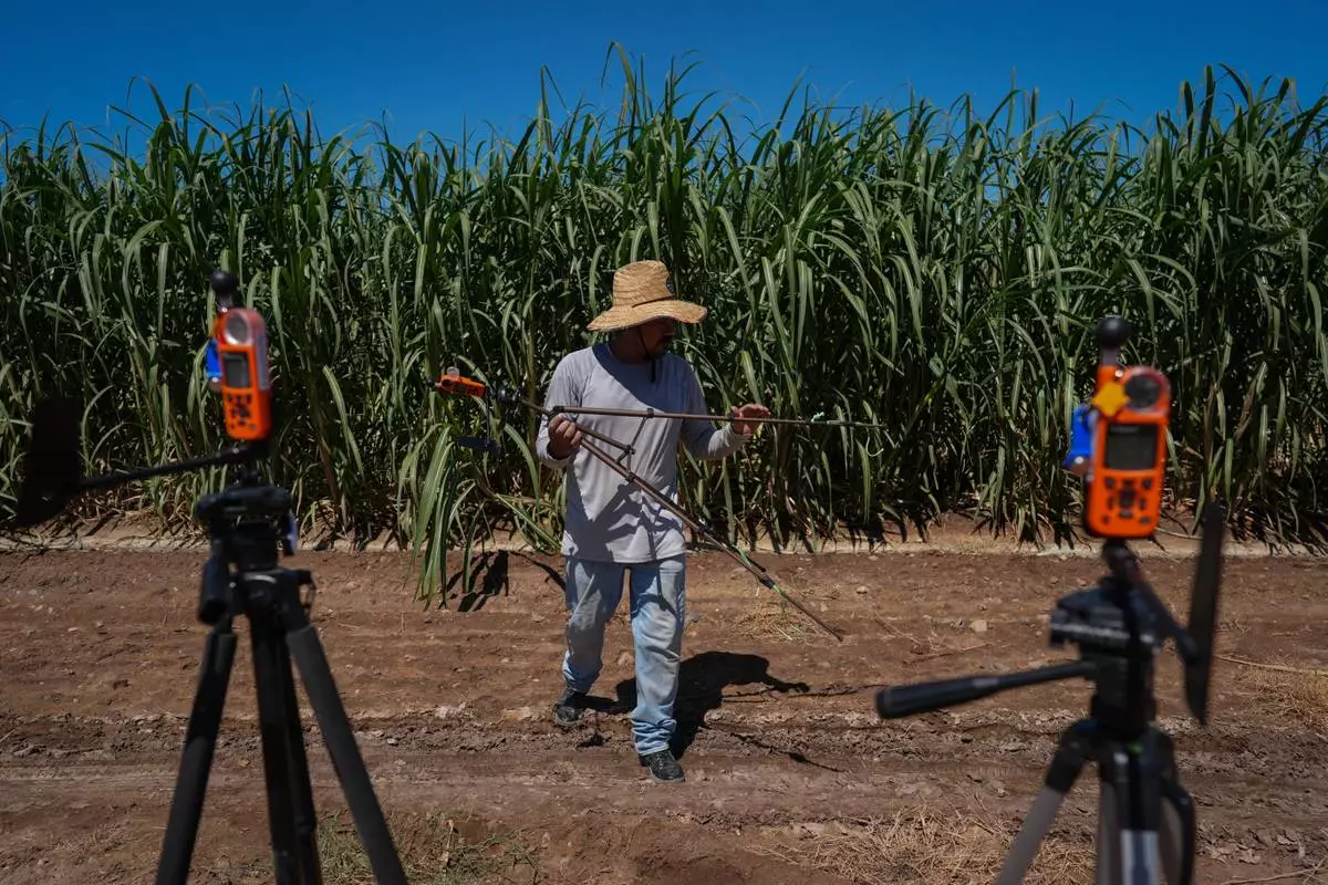 Farmworker Raul Cruz collects environmental monitors at the end of the day in a sugarcane field in Niland, Calif., Thursday, Sept. 11, 2025. (AP Photo/Jae C. Hong)