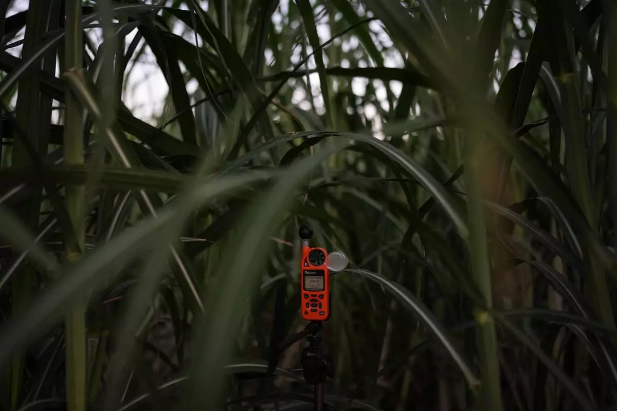 An environmental monitor is placed in a sugarcane field to collect environmental data in Niland, Calif., Thursday, Sept. 11, 2025. (AP Photo/Jae C. Hong)