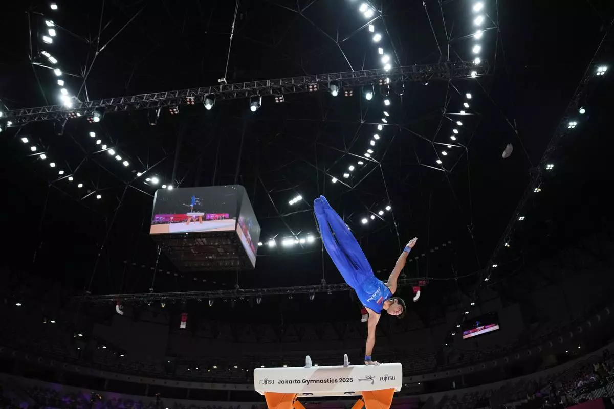 Mamikon Khachatryan of Armenia competes in the men's pommel horse final during the 53rd Artistic Gymnastics World Championships in Jakarta, Indonesia, Friday, Oct. 24, 2025. (AP Photo/Dita Alangkara)